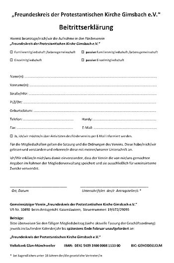 Freundeskreis der Protestantischen Kirche Gimsbach e.V.Vereinsregister-Nr: VR 30490 Beitrittserklärung