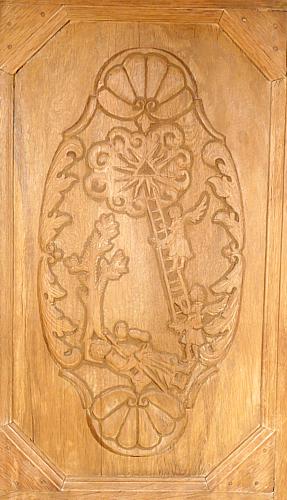 Der dreiteilige Pfarrstuhl, also der Aufenthaltsort des Geistlichen vor der Predigt, besitzt mit Laubwerk verzierte Türpfosten und Rahmen. Seine Front weist im oberen Teil Gitterwerk auf, darunter drei eingetiefte Felder, wobei rechts und links je ein erhabenes Bildfeld Weintrauben und Weinlaub zeigt, die aus einer bauchigen Kanne wachsen. Das mittlere Feld mit der Tür erhält eine Darstellung vom Traum Jakobs von der Himmelleiter, wobei vom Auge Gottes zwei Engel auf der Leiter steigen.