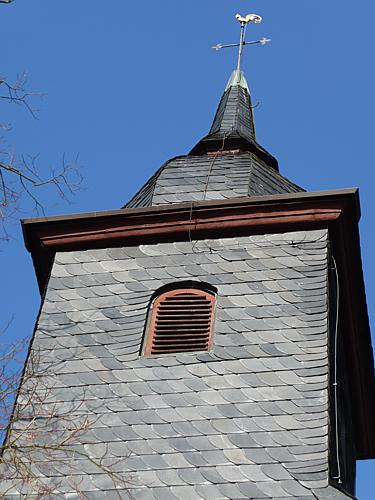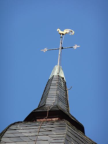 Der schieferverkleidete quadratische Dachreiter ist etwa 22 Meter hoch, er sitzt auf der Südmauer auf und trägt eine geschweifte Haube mit achteckigem aufsitzenden spitzen Kuppelhelm. Den Abschluß bildet auf der Spitze ein Schmiedeeisernes Kreuz mit barockem Rankenwerk und vergoldetem Turmhahn.